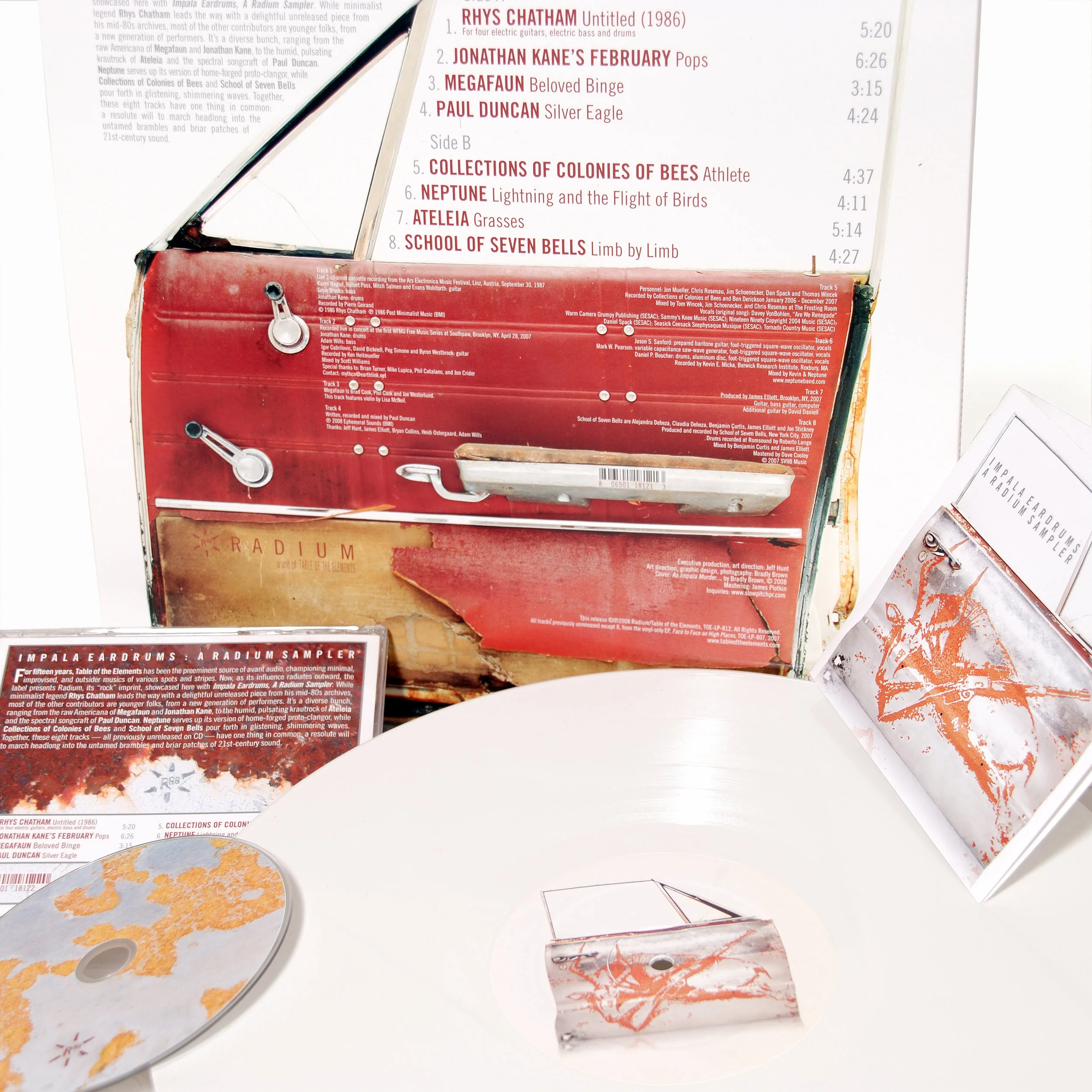 For fifteen years, Table of the Elements has been the preeminent source of avant audio, championing minimal, improvised, and outsider musics of various spots and stripes. Now, as its influence radiates outward, the label presents Radium, its “rock” imprint, showcased here with Impala Eardrums, A Radium Sampler. While minimalist legend Rhys Chatham leads the way with a delightful unreleased piece from his mid-80s archives, most of the other contributors are younger folks, from a new generation of performers. It’s a diverse bunch, ranging from the raw Americana of Megafaun and Jonathan Kane, to the humid, pulsating krautrock of Ateleia and the spectral songcraft of Paul Duncan. Neptune serves up its version of home-forged proto-clangor, while Collections of Colonies of Bees and School of Seven Bells pour forth in glistening, shimmering waves. Together, these eight tracks — all previously unreleased on CD — have one thing in common: a resolute will to march headlong into the untamed brambles and briar patches of 21st-century sound.
