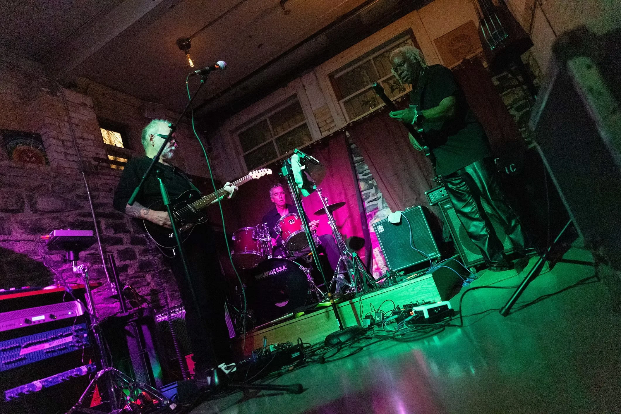 The eponymous debut from Gabrels • Kane • Parker Wells arrives as a thunderclap. Bassist Jair-Rôhm Parker Wells was a member of the seminal krautrock band Embryo during the 1970s, and his ensemble Machine Gun has been lauded as “the MC5 of electric jazz.” His excellence ranges from the diddly bow to the Buchla synthesizer, from the Steinberger bass to the Chapman Stick, and his current projects include an electroacoustic-powered spaceship. Drummer Jonathan Kane co-founded the influential No Wave behemoth Swans. He has collaborated extensively with minimalist godfather La Monte Young, was the only percussionist for Rhys Chatham's orchestra of 100 electric guitars, and leads his own trance-blues band, Jonathan Kane's February. Guitarist Reeves Gabrels produced, co-wrote, and performed on eight albums with David Bowie and is in the Rock and Roll Hall of Fame as a member of The Cure.