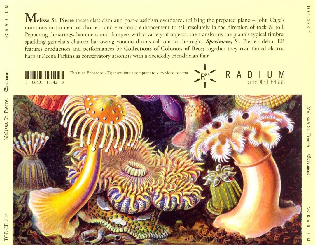 Melissa St. Pierre tosses classicism and post-classicism overboard, utilizing the prepared piano—John Cage's notorious instrument of choice—and electronic enhancement to sail resolutely in the direction of rock & roll. Peppering the strings, hammers, and dampers with a variety of objects, she transforms the piano's typical timbre: sparkling gamelans chatter; harrowing voodoo drums call out in the night. Specimens, St. Pierre's debut, features production and performances by Jon Mueller and Collections of Colonies of Bees; together they rival famed electric harpist Zeena Parkins as conservatory arsonists with a decidedly Hendrixian flair.